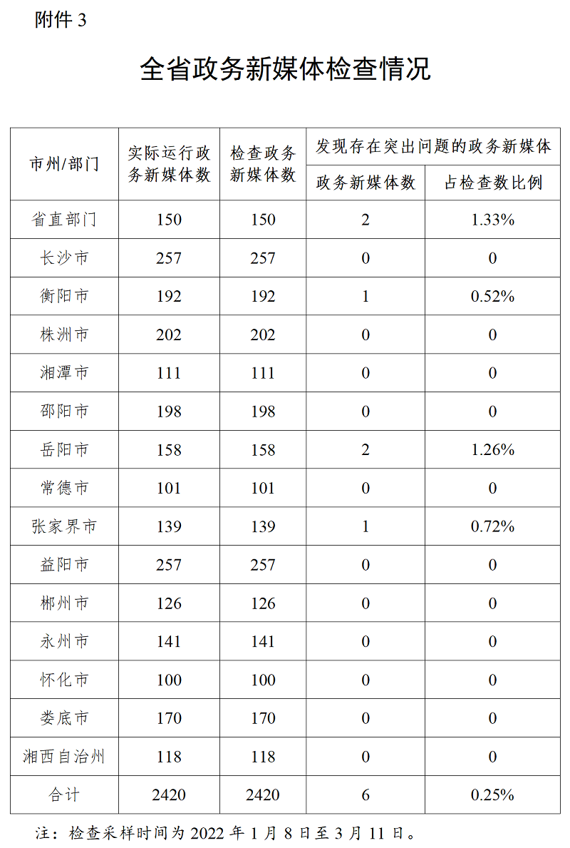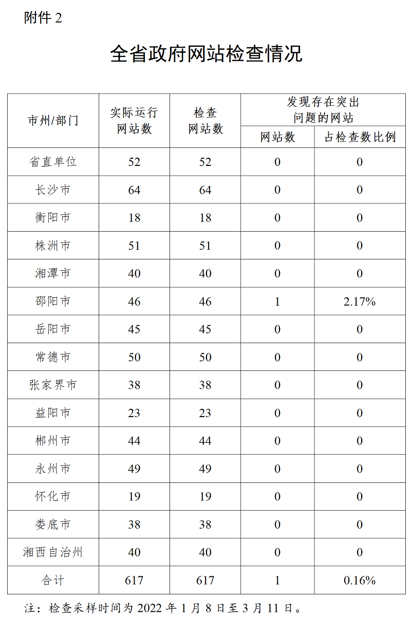 2022年第一季度,省政務(wù)局組織對(duì)全省正常運(yùn)行的617家政府網(wǎng)站進(jìn)行全覆蓋檢查,發(fā)現(xiàn)1家存在單項(xiàng)否決問(wèn)題,總體合格率99.84%。重點(diǎn)檢查了全省136家政府門(mén)戶網(wǎng)站互動(dòng)交流功能,共有61家政府門(mén)戶網(wǎng)站實(shí)現(xiàn)對(duì)簡(jiǎn)單常見(jiàn)咨詢問(wèn)題1個(gè)工作日內(nèi)準(zhǔn)確答復(fù)(詳見(jiàn)附件1)。對(duì)全省正常運(yùn)行的2420家政務(wù)新媒體進(jìn)行普查,發(fā)現(xiàn)6家存在突出問(wèn)題,總體合格率99.75%。長(zhǎng)沙市、株洲市、湘潭市、常德市、益陽(yáng)市、郴州市、永州市、懷化市、婁底市、湘西自治州政府網(wǎng)站和政務(wù)新媒體檢查合格率均達(dá)到100%。