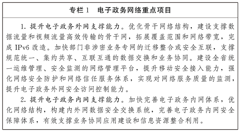 建成“橫向到邊、縱向到底”、支持IPv6(互聯網協議第六版)的電子政務外網,同步建設網絡安全基礎設施,形成全省架構統(tǒng)一、運行高效、安全可靠、彈性調度的新型電子政務外網體系,推進5G(第五代移動通信技術)、區(qū)塊鏈等新技術在電子政務外網領域應用,有效支撐跨層級、跨區(qū)域、跨部門的網絡互通、數據共享、應用協同。拓展電子政務外網覆蓋范圍、加快網絡帶寬擴容,逐步實現萬兆到州市、千兆到縣市區(qū)、百兆到鄉(xiāng)鎮(zhèn)(街道)全覆蓋,村(社區(qū))按需接入,2025年底實現80%行政村覆蓋;推動各地各部門按照“應接盡接”原則接入電子政務外網。提升電子政務內網支撐能力,對政務內網骨干鏈路帶寬進行擴容,按需開展縣級以下部門安全接入政務內網,完善電子政務內網綜合運維管理體系,提升運維保障能力。強化電子政務網絡綜合安全防護,健全統(tǒng)一信任服務體系,推進電子政務內網、外網間數據安全交換。加快推進部門業(yè)務專網(含國家部委業(yè)務專網的省級及以下部分)向電子政務內網、外網遷移整合或安全互聯。