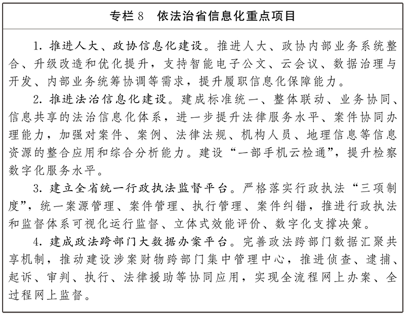 深化立法、監(jiān)督、協商、議政等業(yè)務應用,完善人大代表、政協委員履職信息化應用。構建數據安全、集約高效的政法業(yè)務協同辦理平臺,提升“智慧法院”、“智慧檢務”、“智慧警務”、“智慧司法”應用水平和協同能力,提高審判執(zhí)行、多元解紛、司法公開、法律監(jiān)督、刑罰執(zhí)行、法律服務、協同辦案的智能化水平。推動法治工作資源互聯互通、業(yè)務協同、信息共享,為依法治省提供決策支持。