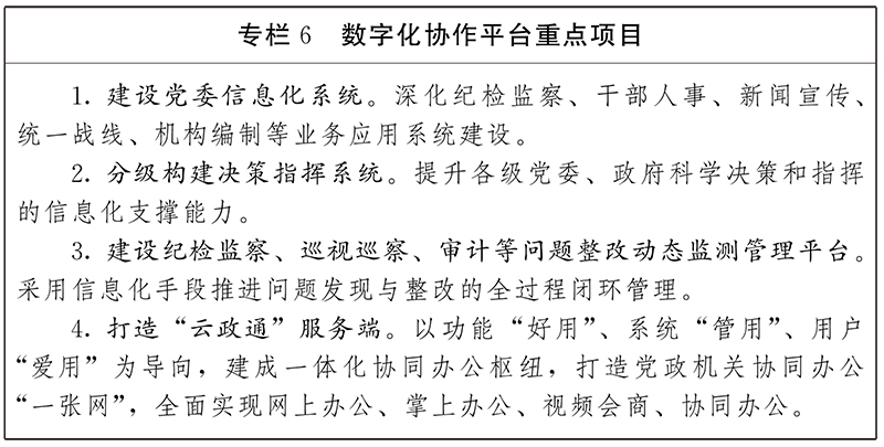 2.統(tǒng)建共用協同辦公平臺。統(tǒng)籌推進協同辦公、數據共享、信息報送、督查督辦等基礎應用建設,加快內部辦公和業(yè)務系統(tǒng)整合共享與升級改造,形成服務送達、綜合辦理、數據監(jiān)測、監(jiān)督反饋的業(yè)務閉環(huán)。建設統(tǒng)一的協同辦公平臺“云政通”,支撐各地各部門組織、人員信息在線分級分層管理,實現非涉密公文全程電子化流轉管理、歸檔移交、遠程會議音視頻互動,推進工作交流會商在線化、移動化、協同化。加快一體化協同辦公體系建設,推動實現機關內部及部門間“一件事”高效協同辦理,積極推行移動辦公。推動機關事務辦公用房、公務用車、公共機構節(jié)能等應用整體升級,降低運行成本。