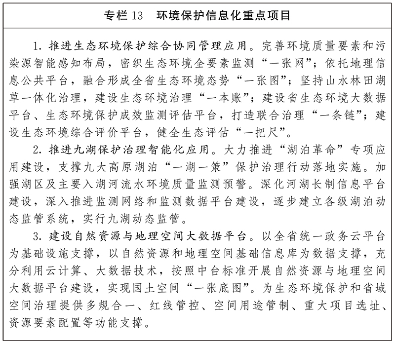 1.加強生態(tài)環(huán)境保護數字化應用。以地理信息公共服務平臺為支撐,加強衛(wèi)星遙感、無人機、視頻監(jiān)控、傳感器“四位一體”綜合應用,完善生態(tài)環(huán)境監(jiān)測網絡,優(yōu)化監(jiān)測點位布局,廣泛開展生態(tài)監(jiān)測物聯網應用。充分利用大數據等手段整合與挖掘生態(tài)環(huán)境監(jiān)測數據資源,提升區(qū)域大氣污染防治、流域污染防治、土壤污染防治等決策能力,構建生態(tài)環(huán)境綜合管理信息化平臺。構建重點江河湖泊治理數字化平臺,匯集生態(tài)環(huán)境、水利、自然資源等部門的基礎數據,重點建設智能感知、數據匯集、綜合應用、多維展示、決策支撐等系統(tǒng)。