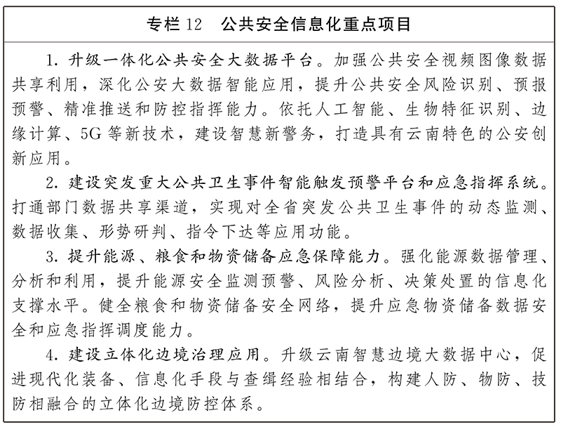 2.加強社會治安數字化應用。推動數字技術在法院、檢察院和司法行政、公安等部門的深度運用,打通辦案平臺,實現全流程網上“輕快”、“便捷”辦案。健全信息化社會治安防控體系,實現預測預警預防。推進“雪亮工程”建設,整合各類視頻監(jiān)控資源,加大在維穩(wěn)、反恐、打擊犯罪等公共安全防范領域的綜合應用,提升防范化解社會風險的能力和水平。加快部署智能感知、信息采集等基礎設施,構建邊境管控數字防控網,推進邊境管控數字化應用,開展邊境車輛、人員大數據分析研判,提升邊境管控指揮系統(tǒng)可視化、數字化、智能化水平。