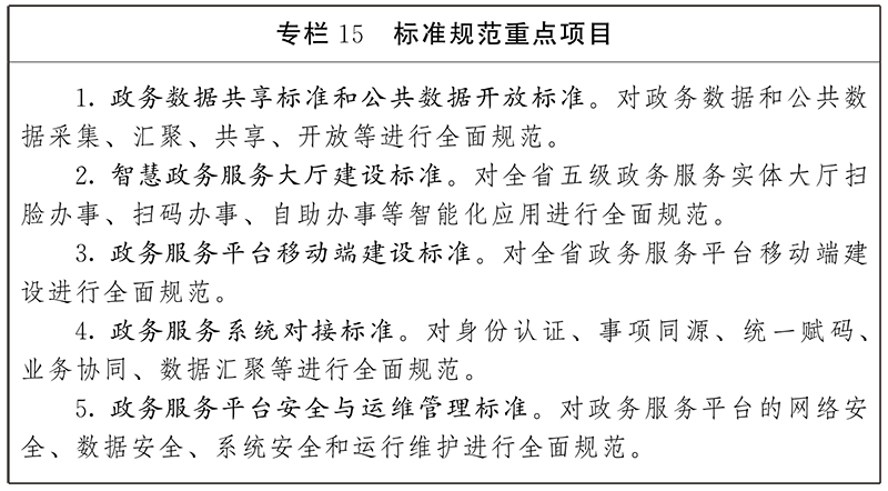 1.制定電子政務標準。圍繞統(tǒng)一基礎設施共建共用、跨部門重點項目建設、數據共享交換等實際工作需要,不斷優(yōu)化完善電子政務標準體系建設,構建科學先進、層次分明、管用實用的標準體系,重點研究制定政務大數據中心、政務云、政務數據質量管理、政務數據采集匯聚和共享開放、政企數據流轉、網絡安全、數據安全、運維服務等一批標準規(guī)范,建立健全政務信息化工程技術參考框架,以標準先行推動系統(tǒng)互聯、業(yè)務協同、信息共享、集約建設。