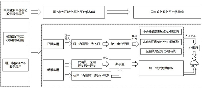 “辦事通”作為全省移動(dòng)政務(wù)服務(wù)的主要提供渠道和總?cè)肟?,與其他省、區(qū)、市政務(wù)服務(wù)平臺(tái)移動(dòng)端、國(guó)務(wù)院部門(mén)政務(wù)服務(wù)平臺(tái)移動(dòng)端和國(guó)家政務(wù)服務(wù)平臺(tái)移動(dòng)端共同構(gòu)成全國(guó)一體化政務(wù)服務(wù)平臺(tái)移動(dòng)端。各地各部門(mén)原則上不再新建獨(dú)立對(duì)外服務(wù)的移動(dòng)政務(wù)服務(wù)應(yīng)用,應(yīng)依托“辦事通”統(tǒng)一對(duì)外提供移動(dòng)政務(wù)服務(wù);已建成的各類(lèi)移動(dòng)政務(wù)服務(wù)應(yīng)用,要按照統(tǒng)一標(biāo)準(zhǔn)規(guī)范和“應(yīng)接盡接”、“應(yīng)上盡上”原則統(tǒng)籌整合并接入“辦事通”。(層級(jí)架構(gòu)見(jiàn)附件1)