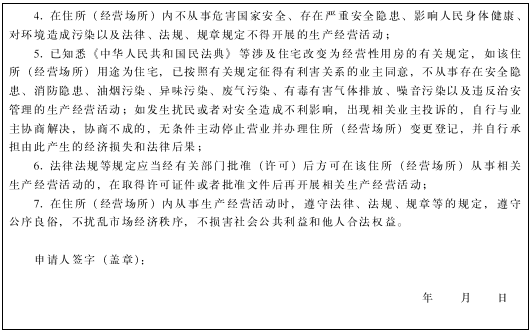 申請人提交《青海省市場主體住所(經(jīng)營場所)自主申報承諾書》的,應(yīng)當對房屋權(quán)屬關(guān)系、使用方式、房屋用途作出符合事實的承諾,并對所申報住所(經(jīng)營場所)的真實性、合法性、有效性和安全性作出承諾,承擔因虛假承諾等所造成的一切法律責任。登記機關(guān)在營業(yè)執(zhí)照上住所(經(jīng)營場所)后標注“自主申報”字樣。