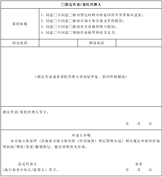 2.符合《青海省市場主體住所(經(jīng)營場所)登記管理辦法》規(guī)定的經(jīng)營場所使用相關(guān)文件或者《青海省市場主體住所(經(jīng)營場所)自主申報承諾書》(撤銷登記時不需要提交)。
