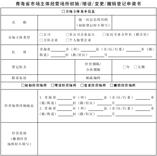 1.《青海省市場主體經(jīng)營場所初始/增設(shè)/變更/撤銷登記申請書》。