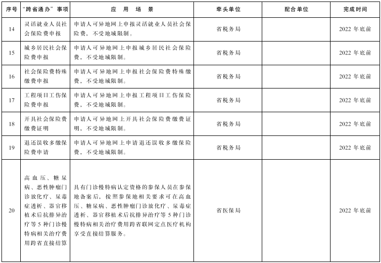 加強(qiáng)數(shù)字政府建設(shè),不斷提升政務(wù)服務(wù)標(biāo)準(zhǔn)化、規(guī)范化、便利化水平,按照國務(wù)院統(tǒng)一部署,組織實(shí)施政務(wù)服務(wù)“跨省通辦”新增任務(wù)清單辦理工作。2022年底前,實(shí)現(xiàn)14項(xiàng)政務(wù)服務(wù)事項(xiàng)“跨省通辦”;2023年6月底前,實(shí)現(xiàn)3項(xiàng)政務(wù)服務(wù)事項(xiàng)“跨省通辦”;2023年底前,實(shí)現(xiàn)3項(xiàng)政務(wù)服務(wù)事項(xiàng)“跨省通辦”。在此基礎(chǔ)上,圍繞人口流動(dòng)、生產(chǎn)要素自由流動(dòng)和全國統(tǒng)一大市場(chǎng)建設(shè)的需求,深化“全程網(wǎng)辦”、拓展“異地代收代辦”和優(yōu)化“多地聯(lián)辦”等形式實(shí)現(xiàn)更多政務(wù)服務(wù)事項(xiàng)“跨省通辦”,不斷拓展“跨省通辦”覆蓋面,滿足企業(yè)和群眾異地辦事需求。