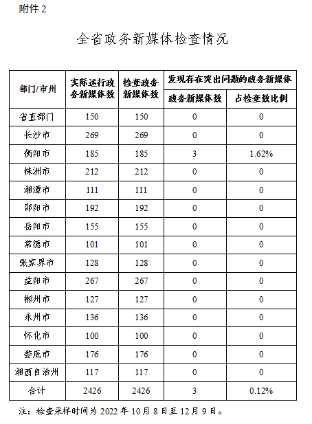 2022年第四季度,省政務(wù)局組織對全省正常運(yùn)行的619家政府網(wǎng)站進(jìn)行了全覆蓋檢查,無存在單項(xiàng)否決問題網(wǎng)站,總體合格率100%。對全省正常運(yùn)行的2426家政務(wù)新媒體進(jìn)行了普查,發(fā)現(xiàn)3家存在突出問題,總體合格率99.88%。長沙市、株洲市、湘潭市、邵陽市、岳陽市、常德市、張家界市、益陽市、郴州市、永州市、懷化市、婁底市、湘西自治州政府網(wǎng)站和政務(wù)新媒體檢查合格率均達(dá)到100%。