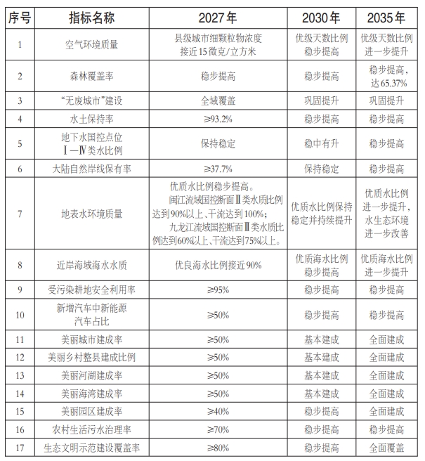 到2035年,生態(tài)文明全面提升,能源和水資源利用效率達(dá)到國際先進(jìn)水平,綠色發(fā)展方式和生活方式全面形成,碳排放達(dá)峰后穩(wěn)中有降,重點(diǎn)領(lǐng)域基本實(shí)現(xiàn)深度脫碳,國土空間開發(fā)保護(hù)新格局全面形成,生態(tài)環(huán)境健康優(yōu)美,美好生活品質(zhì)全民普惠共享,生態(tài)環(huán)境治理體系和治理能力現(xiàn)代化水平進(jìn)一步提升,美麗福建全面建成。