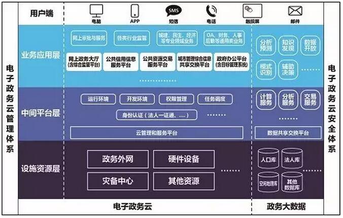 市級云架構:由設施資源層、中間平臺層、業(yè)務應用層組成,在政務云管理體系和安全體系保障下,通過各類用戶終端,為政府內部提供統(tǒng)一信息化支撐,向社會公眾提供高效外部服務。(圖2)