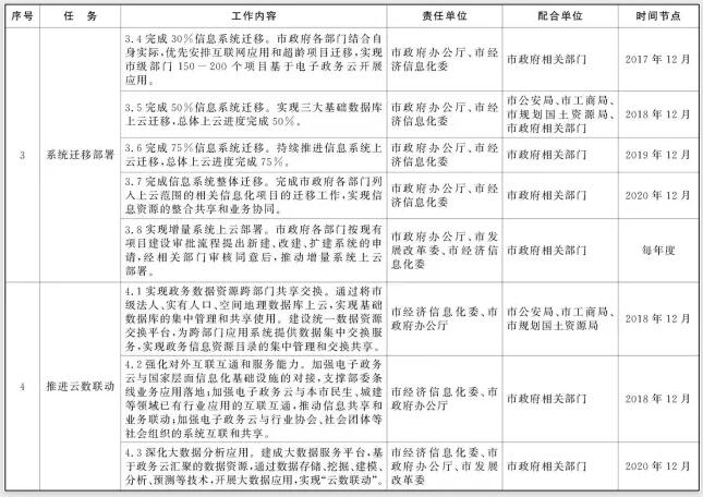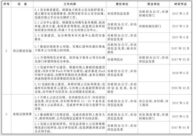 2016年9月前,市政府辦公廳根據(jù)計劃安排,匯總并梳理各部門2017年擬上云的項目范圍和清單;市經(jīng)濟信息化委根據(jù)上云遷移計劃,完成相應的信息化項目在下一年度的運維方案和運維資金調整;市財政局對預算資金予以保障。