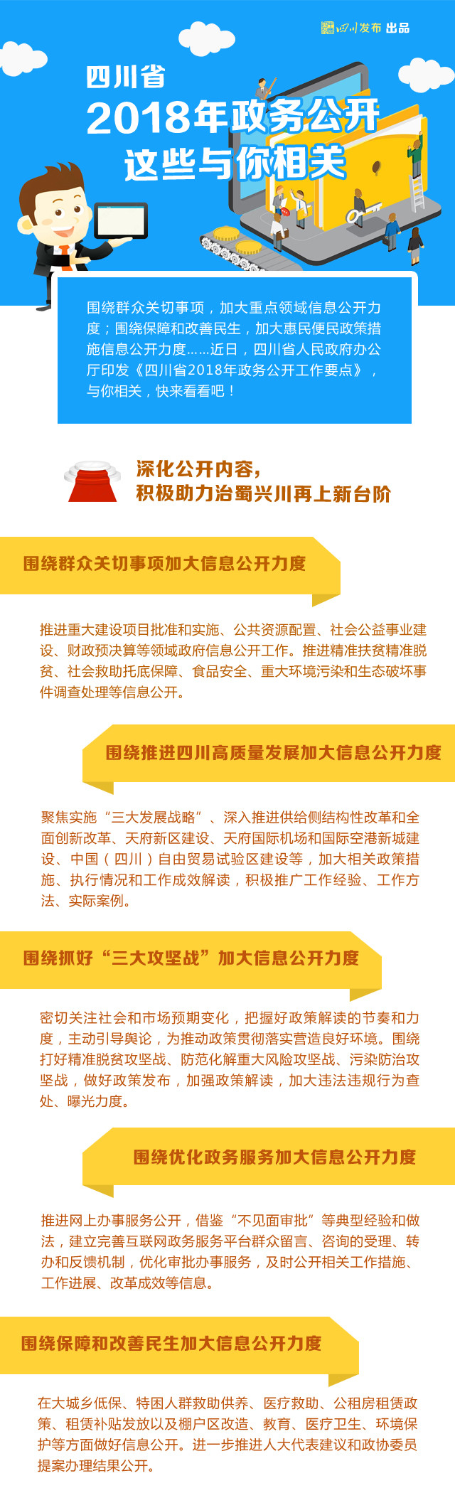 如何讓政府工作公開透明,讓政務(wù)信息傳達(dá)給有需要的辦事群眾?做好政務(wù)公開工作是突破口。近日,省政府辦公廳印發(fā)《四川省2018年政務(wù)公開工作要點(diǎn)》((簡稱《工作要點(diǎn)》)),今年四川將從深化公開內(nèi)容、完善公開程序、豐富公開方式、強(qiáng)化試點(diǎn)引領(lǐng)四個大方面來對政務(wù)公開工作再“升級”。