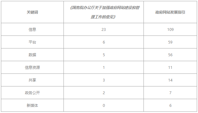 相比于12年前國辦發(fā)布的《關(guān)于加強政府網(wǎng)站建設(shè)和管理工作的意見》,本次發(fā)布的《政府網(wǎng)站發(fā)展指引》中“信息”、“平臺”、“數(shù)據(jù)”三個詞的出現(xiàn)次數(shù)分別提升了5倍和10倍,出現(xiàn)頻次分別為109次、59次和56次,而“新媒體”在12年前出現(xiàn)頻次為0,究其原因主要有三個方面: