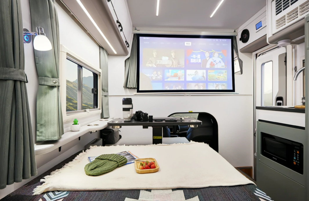 上汽大通MAXUS探索家T90縱橫除了廚衛(wèi)設(shè)施和家電設(shè)備一應(yīng)俱全之外,還可以選裝“智慧選裝包”中的房車管家。房車管家是一個集語音、大屏和APP三位一體的智能控制系統(tǒng),它的存在可以讓家電的使用更加便捷,帶來更智能化的家居生活。尤其是語音功能,讓設(shè)備使用更簡單。比如你想要開空調(diào),只需喊“你好,小邁,打開空調(diào)”,空調(diào)就會自動打開。它還可以通過預(yù)先設(shè)置模式,實(shí)現(xiàn)一鍵或者一句話開關(guān)一系列設(shè)備,比如你可以設(shè)置“入睡”模式,然后喊一聲“你好,小邁,我要睡覺”,那么燈、空調(diào)、車窗、窗簾便會依次自動關(guān)閉,娛樂設(shè)備自動停止播放,空調(diào)也會被調(diào)至合適的溫度,非常省心。由此來看,和中規(guī)中矩的覽眾自由炮相比,上汽大通MAXUS探索家T90縱橫更加智能化。