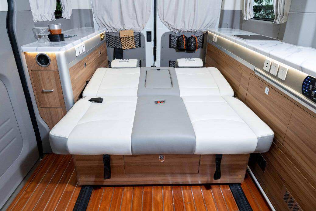到了晚上,將上汽大通MAXUS V90露營版的乘客區(qū)雙人座椅調(diào)節(jié)至90度全傾倒,就變成了一張舒適的臥榻。拉上隱私窗簾、打開小夜燈,在寧靜的夜晚,伴隨著星星點(diǎn)點(diǎn)入睡,第二天再開啟美好旅程。
