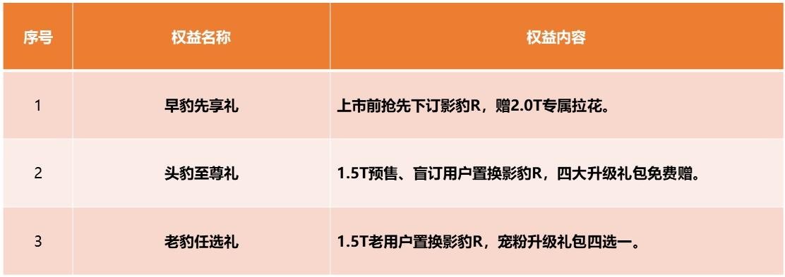 第二類是原影豹1.5T預(yù)售(含盲訂)客戶,派發(fā)“頭豹至尊禮”,也就是說能享受“外飾+內(nèi)飾+智能+性能”四重權(quán)益禮包。小孩子才做選擇,原影豹1.5T預(yù)售客戶全都要,從內(nèi)而外,寵愛加倍。
