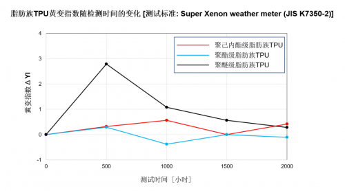 圖2:脂肪族TPU黃變指數(shù)隨檢測時間變化