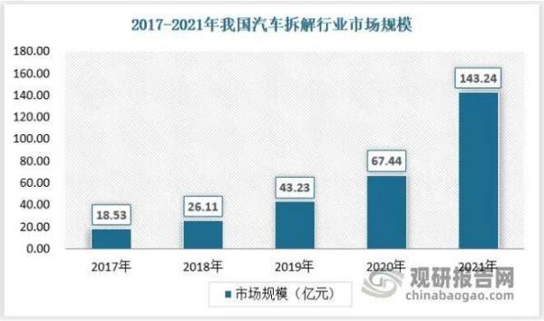 據(jù)觀研報告網(wǎng)《中國汽車拆解行業(yè)發(fā)展趨勢分析與投資前景研究報告(2022-2029年)統(tǒng)計(jì),我國汽車拆解行業(yè)市場規(guī)模不斷擴(kuò)大,汽車拆解數(shù)量由2017年的132.37萬輛增至2021年的462.06萬輛,復(fù)合年化增長率達(dá)到36.69%;汽車拆解行業(yè)市場規(guī)模從2017年18.53億元快速增長至2021年143.24億元,年均復(fù)合增長率為66.74%,保持較快增長態(tài)勢。
