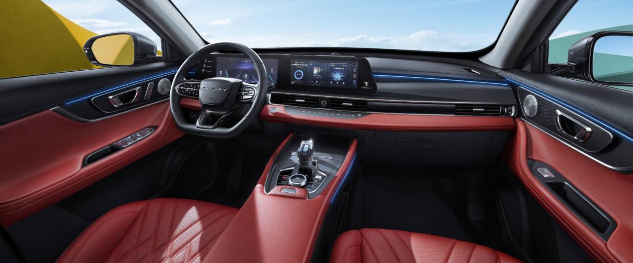 水晶刀鋒前格柵和晶彩靈眸前大燈的搭配相得益彰,彰顯用戶的時尚品味。全貫穿時尚LED尾燈極具辨識度盡顯科技前衛(wèi),拉伸車寬,更穩(wěn)健更大氣,天穹懸浮式車頂采用B/C/D柱隱藏設(shè)計,在渲染車頂懸浮效果的同時更具視覺沖擊,更有神秘感,木蘭紅的內(nèi)飾配色時尚感十足!