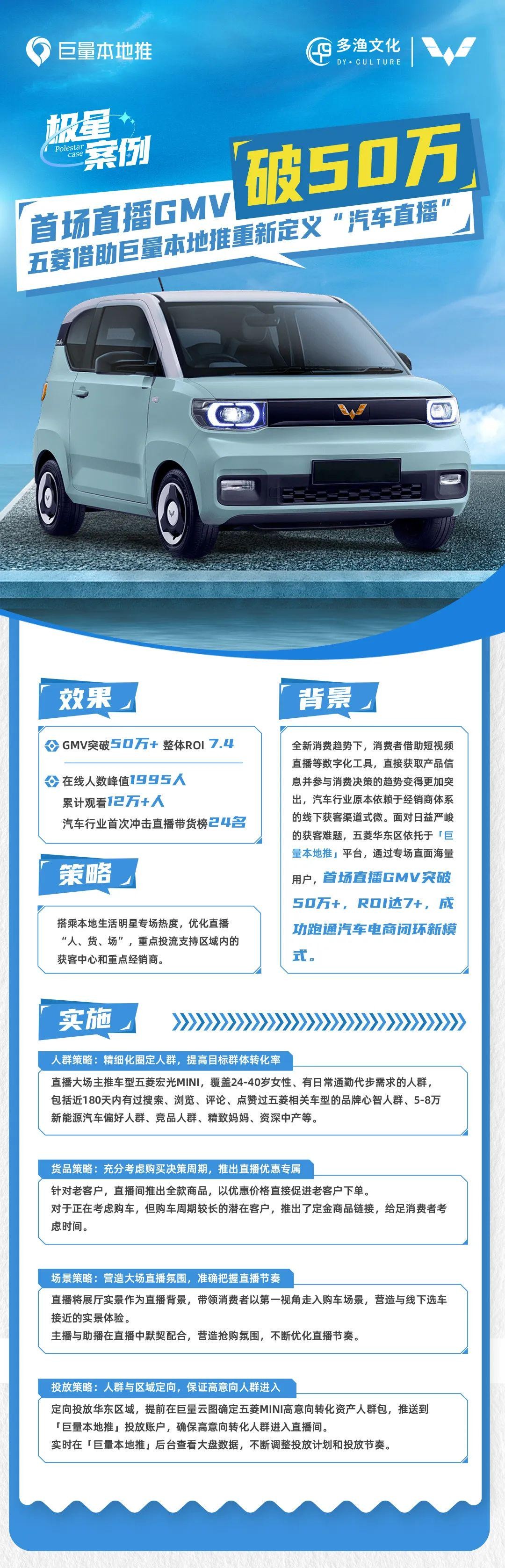 依托于「巨量本地推」平臺,通過搭乘本地生活明星專場熱度,在抖音平臺直播售賣整車和定金等商品套餐,并投流支持區(qū)域內(nèi)的獲客中心和重點經(jīng)銷商。期間克服了經(jīng)銷商缺乏大場直播經(jīng)驗、行業(yè)缺乏團購商品直播經(jīng)驗以及籌備時間不足等困難,成為汽車行業(yè)首個本地生服團購【巨量本地推】直播案例,實現(xiàn)首場直播GMV突破50萬,ROI達(dá)7+的戰(zhàn)績,成功跑通汽車電商新模式。如此引人矚目的成績是如何達(dá)成的呢?巨量本地推總結(jié)了五菱華東區(qū)的專場直播策略,一起來看看吧!