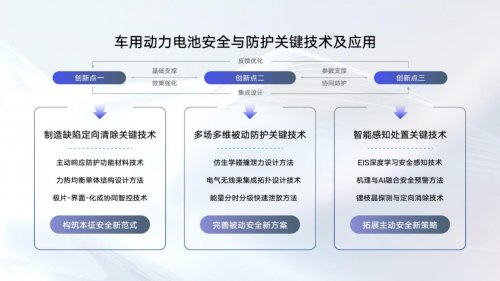 “車用動力電池安全與防護(hù)關(guān)鍵技術(shù)及應(yīng)用”項目,通過在本征安全、被動安全、主動安全三個層面,構(gòu)建“電芯-系統(tǒng)-端云協(xié)同診斷”的全方位安全保障體系,實現(xiàn)了“電芯設(shè)計好、制造好、系統(tǒng)防護(hù)好、整車預(yù)警好”的創(chuàng)新突破設(shè)計,盡展標(biāo)桿實力。