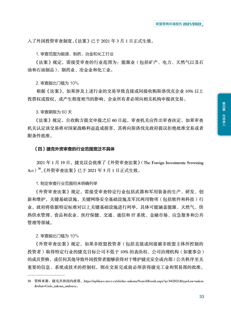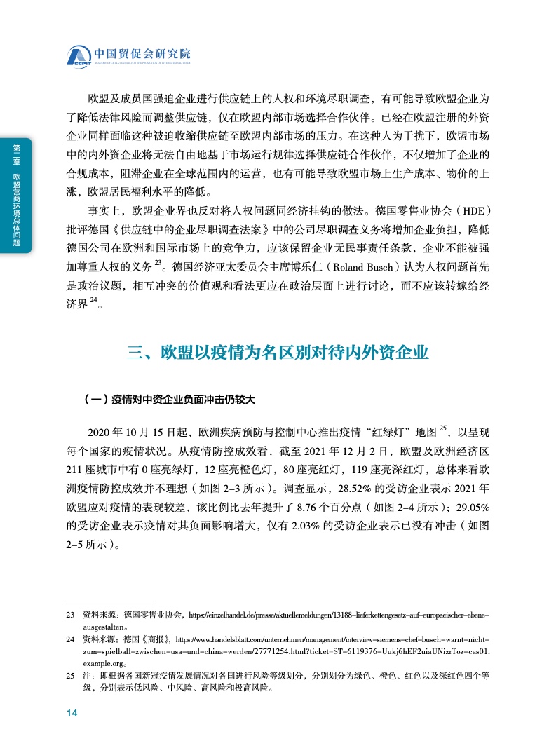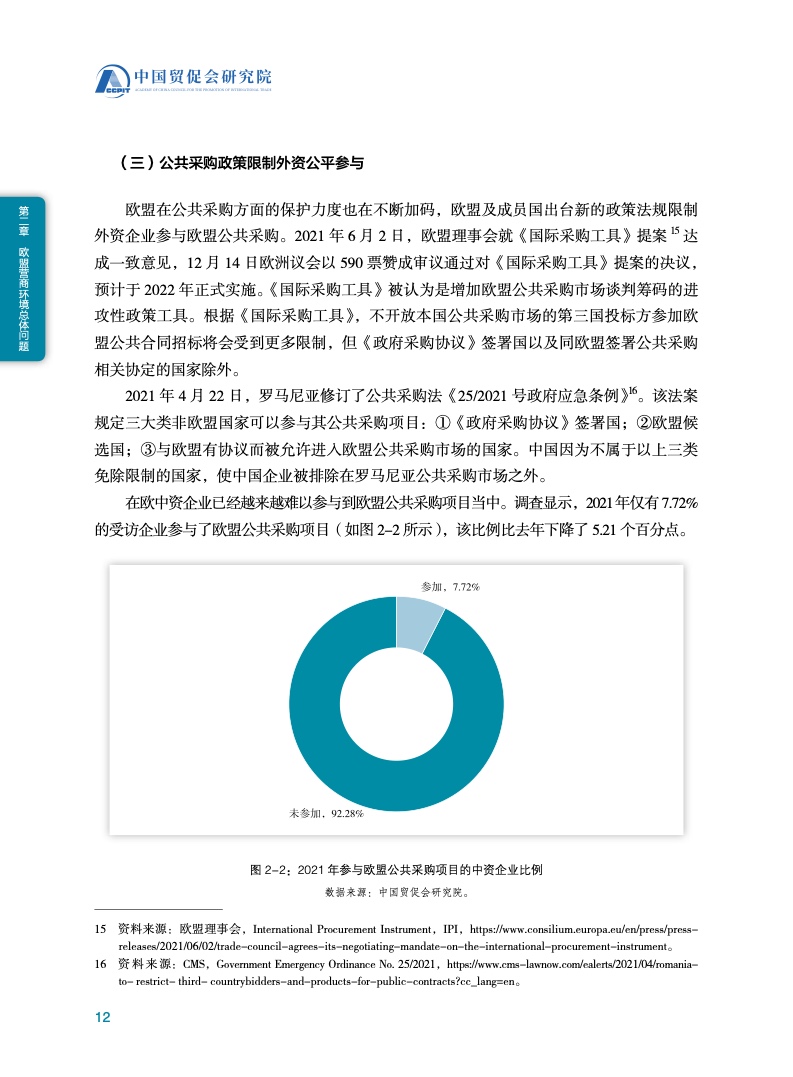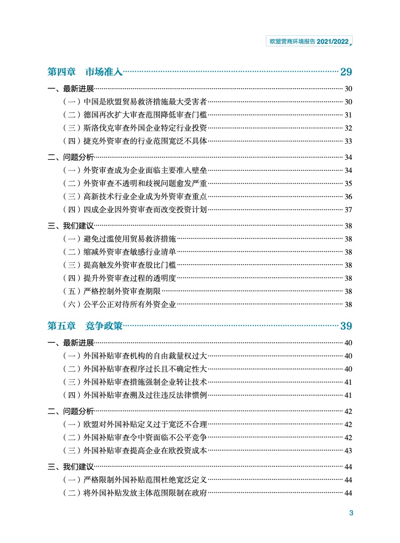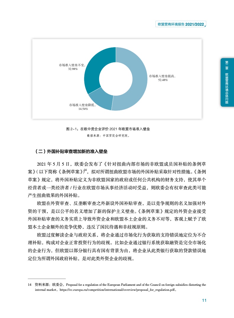 《報(bào)告》認(rèn)為,歐盟的營(yíng)商環(huán)境仍有待改善,例如在外資審查、外國(guó)補(bǔ)貼審查、公共采購(gòu)審查等方面市場(chǎng)準(zhǔn)入壁壘較高,給與歐盟開展貿(mào)易投資合作的中國(guó)企業(yè)造成不利影響。