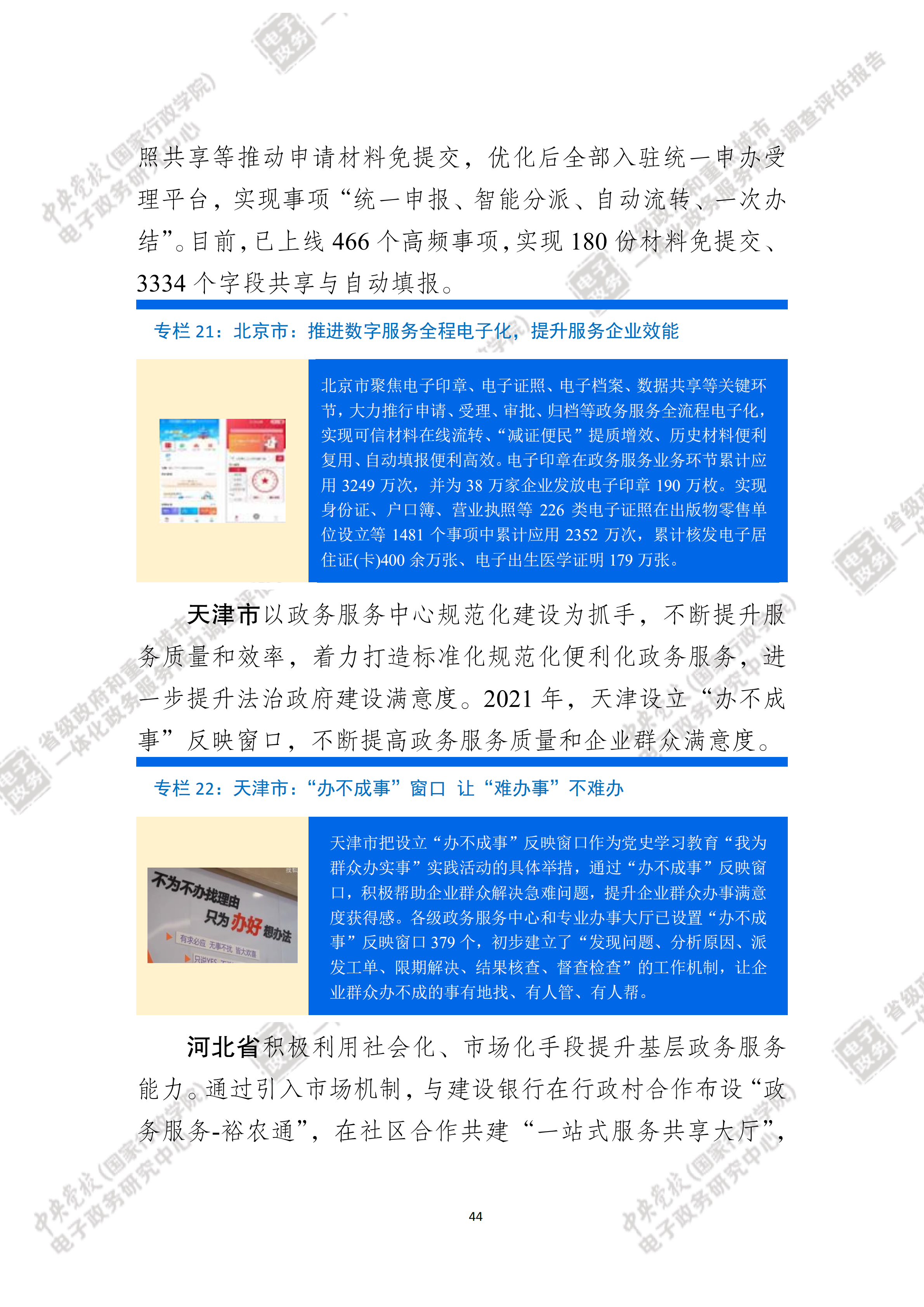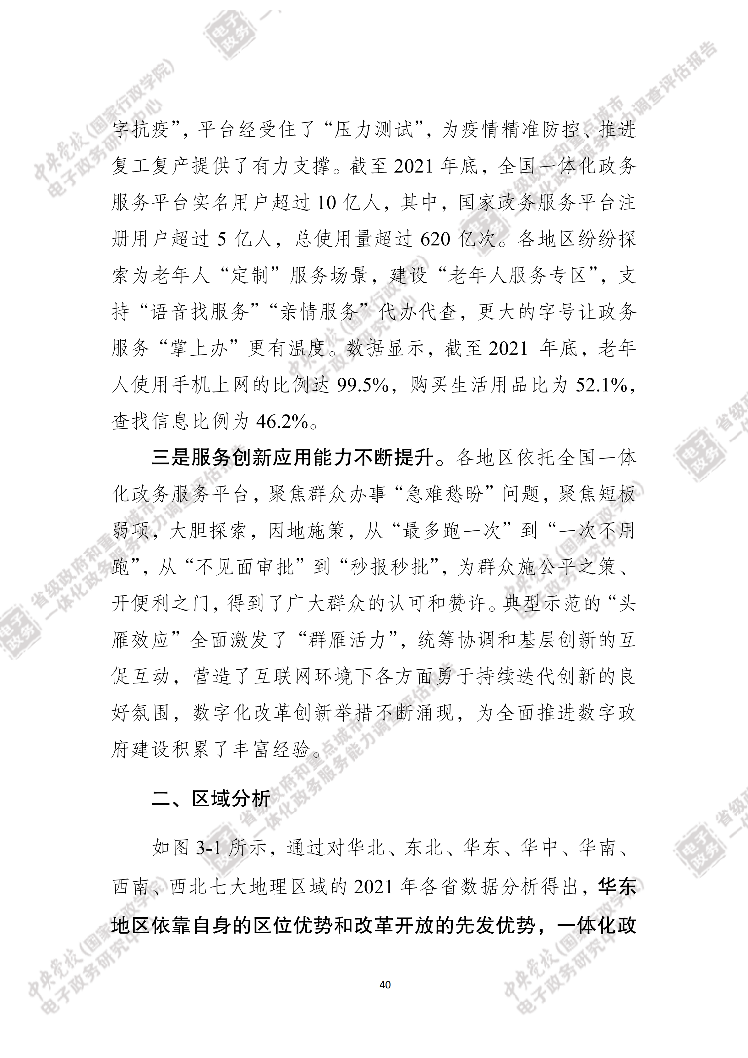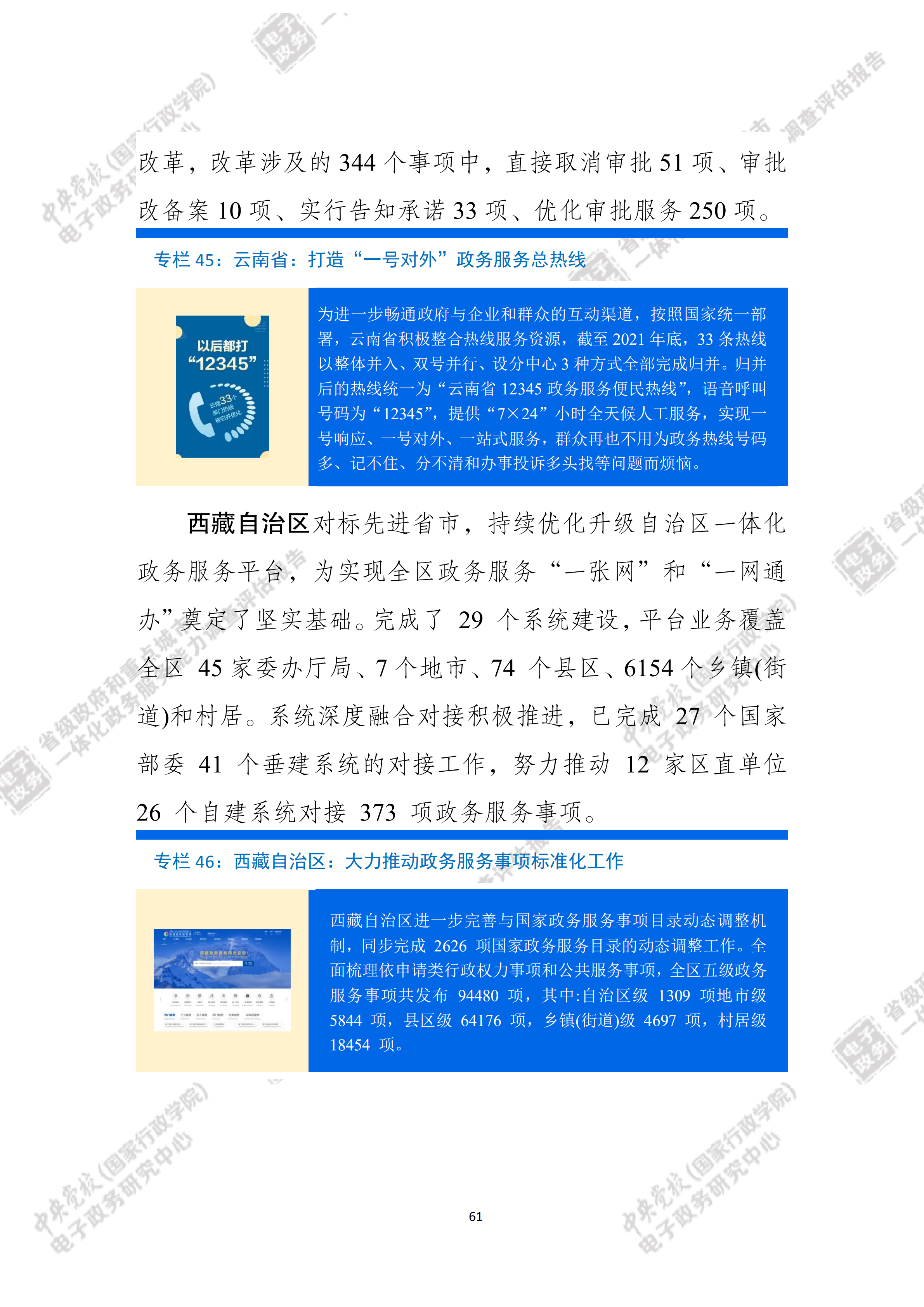評估報告認(rèn)為,深化“互聯(lián)網(wǎng)+政務(wù)服務(wù)”,是一項關(guān)系政府職能重塑、釋放改革紅利、切實便民利企的重要改革,對于提高政務(wù)服務(wù)能力和水平,便利企業(yè)和群眾辦事創(chuàng)業(yè),推進(jìn)政府治理現(xiàn)代化具有重要意義。2021年,各地區(qū)依托全國一體化政務(wù)服務(wù)平臺,聚焦企業(yè)群眾辦事的“急難愁盼”問題,因地施策、積極創(chuàng)新,典型示范的“頭雁效應(yīng)”全面激發(fā)了“群雁活力”,從“最多跑一次”到“一次不用跑”,從“不見面審批”到“秒報秒批”,為群眾施公平之策、開便利之門,得到了廣大群眾的認(rèn)可和贊許。