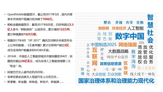 通過這樣一組數(shù)據(jù),我們也可以看到近幾年在人工智能、共享經(jīng)濟(jì)、公益方面出現(xiàn)了很多值得關(guān)注的變化。生產(chǎn)關(guān)系和社會(huì)關(guān)系實(shí)際上也在經(jīng)歷著數(shù)字化洗禮、網(wǎng)絡(luò)化重塑和分權(quán)化再造,這種情況下我們政府治理模式也進(jìn)入了新的歷史階段。