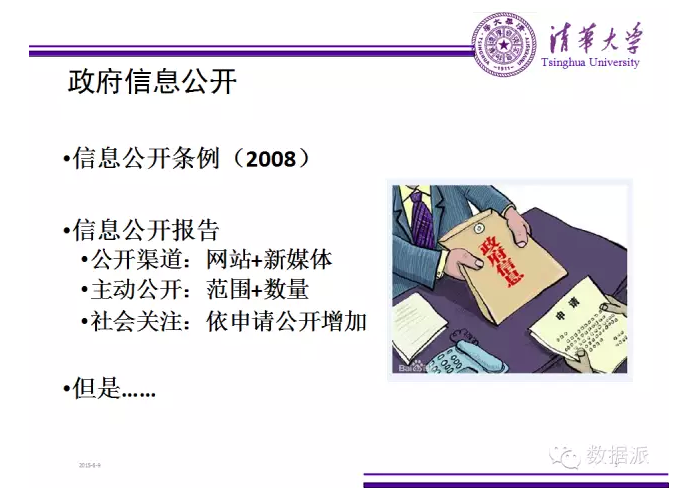 政務(wù)公開(kāi)是五公開(kāi):決策、執(zhí)行、管理、服務(wù)、結(jié)果五公開(kāi)。這把原來(lái)的信息公開(kāi)的邊界進(jìn)行了擴(kuò)展,我們的界定是:政務(wù)公開(kāi)除了結(jié)果信息的公開(kāi),也關(guān)過(guò)程公開(kāi),而政府?dāng)?shù)據(jù)開(kāi)放是政務(wù)公開(kāi)中的一個(gè)新領(lǐng)域,這里面講的更多的是專業(yè)類的,甚至規(guī)模很大,超出原來(lái)信息公開(kāi)個(gè)人能夠理解規(guī)模的政府持有數(shù)據(jù)的公開(kāi)。他的開(kāi)放不完全是一個(gè)依申請(qǐng)簡(jiǎn)單公開(kāi)的過(guò)程,他需要考慮到信息到達(dá)問(wèn)題,考慮到誰(shuí)來(lái)對(duì)數(shù)據(jù)進(jìn)行分析、利用、加工、解讀的問(wèn)題。政務(wù)公開(kāi)和數(shù)據(jù)開(kāi)放是們我所關(guān)注的兩個(gè)方面,下面從這兩方面分別討論:
