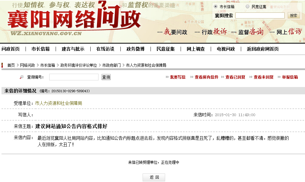 襄陽市政府網(wǎng)站"市長信箱"欄目截圖