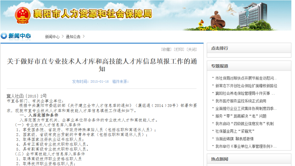 襄陽人社局網(wǎng)站“通知公告”欄目截圖
