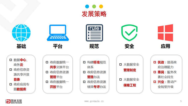 政務(wù)大數(shù)據(jù)的發(fā)展主要分為五個方面:基礎(chǔ)、平臺、規(guī)范、安全、應(yīng)用。