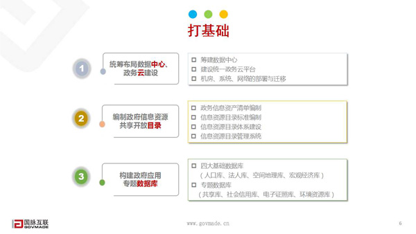 在打基礎(chǔ)上,各級政府部門需要統(tǒng)籌布局?jǐn)?shù)據(jù)中心、政務(wù)云建設(shè),在政務(wù)云建設(shè)之后要重點(diǎn)考慮籌建數(shù)據(jù)中心,建設(shè)統(tǒng)一政務(wù)云平臺還有機(jī)房、系統(tǒng)、網(wǎng)絡(luò)的部署與遷移;在編制政府信息資源、共享開放目錄方面,從政務(wù)信息資產(chǎn)清單編制到信息資源目錄標(biāo)準(zhǔn)編制再到信息資源目錄體系建設(shè)以及信息資源目錄管理系統(tǒng)的建設(shè)都非常重要。信息資源共享開放目錄是基礎(chǔ)工程也是非常重要的工程。構(gòu)建政府應(yīng)用專題數(shù)據(jù)庫方面,除了構(gòu)建四大基礎(chǔ)數(shù)據(jù)庫(人口庫、法人庫、空間地理庫、宏觀經(jīng)濟(jì)庫),還要構(gòu)建專題數(shù)據(jù)庫(共享庫、社會信用庫、電子證照庫、環(huán)境資源庫)。