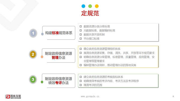 無論是建目錄、建平臺還是做共享開放等等之前都要規(guī)定一個規(guī)范,規(guī)范也是目前各級政府很難做數(shù)據(jù)開展的源頭,所以規(guī)范是非常重要的。規(guī)范首先是要構(gòu)建標(biāo)準(zhǔn)規(guī)范體系,包括數(shù)據(jù)資源分類分級標(biāo)準(zhǔn)、元數(shù)據(jù)標(biāo)準(zhǔn)、數(shù)據(jù)編碼標(biāo)準(zhǔn)、數(shù)據(jù)共享開放機(jī)制、平臺接口標(biāo)準(zhǔn)。比較重要的是制定政府信息資源管理辦法,管理辦法主要是確立政府信息資源管理組織體系,厘清信息資源采集、存儲、清洗、共享、開放等環(huán)節(jié)規(guī)范要求,明確信息資源分級管理、標(biāo)準(zhǔn)管理、質(zhì)量管理、應(yīng)用管理、安全管理等管理要求,編制管理辦法細(xì)則,推動管理辦法的落地實(shí)施。同時因?yàn)楣芾磙k法很難細(xì)化,所以需要制定政府信息資源績效考評辦法,建立政府信息資源的考核指標(biāo)體系,明確績效考核的考評內(nèi)容、考評方法及考評程序,理清考評的范圍。