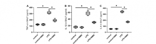 為了評(píng)估肺部炎癥,研究人員測(cè)量了稱為細(xì)胞因子的分子。一些最常見的與炎癥相關(guān)的細(xì)胞因子、TNF-α、IL-1β 和IL-6在膿毒癥模型小鼠的肺液中升高。然而,NMN治療降低了所有三種促炎標(biāo)志物的蛋白質(zhì)水平,表明NMN減少了肺部感染引起的炎癥。