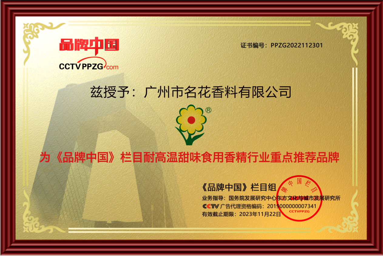 名花香料在國(guó)內(nèi)外有良好的人文氛圍和品牌口碑,2022年獲得《品牌中國(guó)》欄目重點(diǎn)推薦品牌,名花香料秉承以人為本、持續(xù)改進(jìn)、品質(zhì)卓越、真誠(chéng)服務(wù)的品牌理念獲得行業(yè)客戶的青睞。