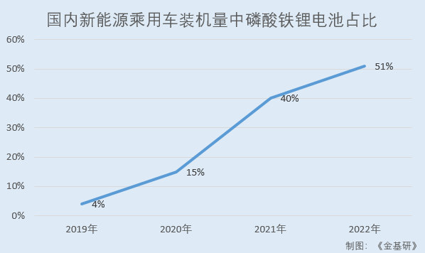 據(jù)高工鋰電統(tǒng)計,2019-2021年,國內(nèi)新能源乘用車裝機量中,三元材料電池裝機量占比分別為89%、82%、60%,而磷酸鐵鋰電池裝機量占比分別為4%、15%、40%,磷酸鐵鋰電池占比大幅增長。2022年1-6月新能源乘用車裝機量中,三元材料和磷酸鐵鋰電池裝機量占比分別為49%和51%,磷酸鐵鋰電池占比超過三元電池。