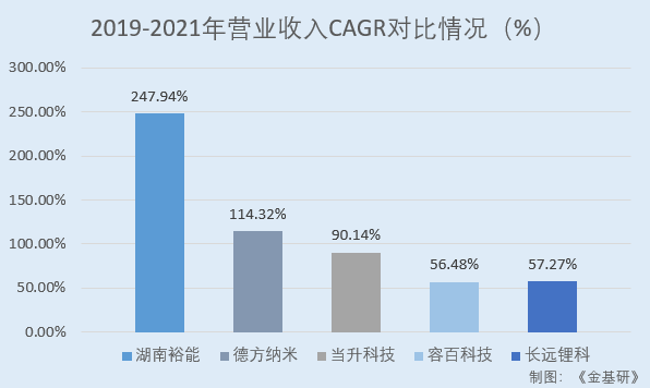 2019-2021年,湖南裕能同行業(yè)可比公司深圳市德方納米科技股份有限公司(以下簡稱“德方納米”)的營業(yè)收入CAGR為114.32%;北京當(dāng)升材料科技股份有限公司(以下簡稱“當(dāng)升科技”)的營業(yè)收入CAGR為90.14%;寧波容百新能源科技股份有限公司(以下簡稱“容百科技”)的營業(yè)收入CAGR為56.48%;湖南長遠鋰科股份有限公司(以下簡稱“長遠鋰科”)的營業(yè)收入CAGR為57.27%。
