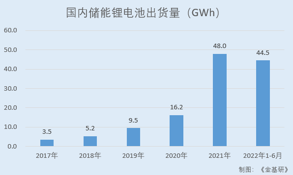 據(jù)高工鋰電數(shù)據(jù),2017-2021年,國內(nèi)儲能鋰電池的出貨量分別為3.5GWh、5.2GWh、9.5GWh、16.2GWh、48.0GWh,2022年1-6月國內(nèi)儲能鋰電池出貨量達44.5GWh,同比增長超200%。