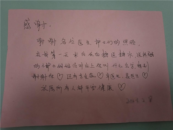 “謝謝各位醫(yī)生、護(hù)士們的照顧,在我第一天術(shù)后低血糖送糖水、送熱粥的護(hù)士小姐姐沒(méi)對(duì)應(yīng)上你叫什么名字,特別謝謝你?(^_-)還有李全蕊、卓醫(yī)生、袁醫(yī)生。祝愿所有人都平安健康!”