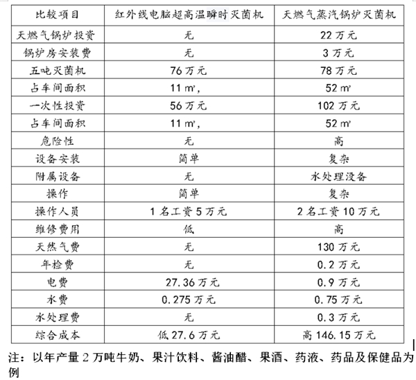 紅外線電腦超高溫瞬時(shí)滅菌機(jī)每臺(tái)總投資56萬(wàn)元,傳統(tǒng)蒸汽滅菌機(jī)總投資103萬(wàn)元,包括滅菌機(jī)、鍋爐及鍋爐房、水處理設(shè)備。“紅外線電腦超高溫瞬時(shí)滅菌機(jī)”節(jié)約投資27萬(wàn)元。紅外線滅菌機(jī),年生產(chǎn)2萬(wàn)噸飲品能源成本27.6萬(wàn)元。傳統(tǒng)蒸汽滅菌機(jī)年生產(chǎn)2萬(wàn)噸飲品能源成本146.15萬(wàn)元,紅外線電腦超高溫瞬時(shí)滅菌機(jī)年節(jié)約生產(chǎn)耗能成本118.55萬(wàn)元。紅外線電腦超高溫瞬時(shí)滅菌機(jī)”與“傳統(tǒng)蒸汽滅菌機(jī)”相比有以下七大綜合優(yōu)點(diǎn):