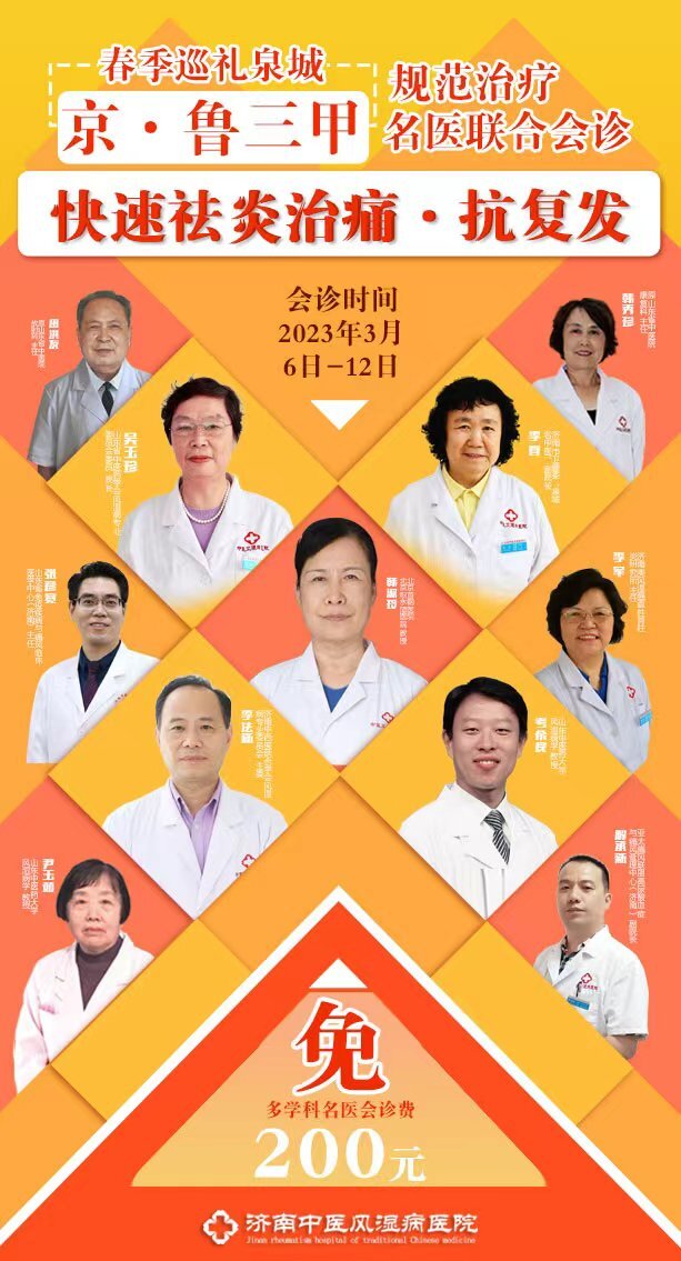 如何讓廣大風(fēng)濕疾病患者“快速祛炎治痛·抗復(fù)發(fā)”,同時兼顧到痛風(fēng)、風(fēng)濕疾病“早發(fā)現(xiàn)、早診斷、早治療”規(guī)范化的診療原則,將疾病扼殺于萌芽之中,濟(jì)南中醫(yī)風(fēng)濕病醫(yī)院院委會決定由吳玉珍院長、李春副院長率領(lǐng)多學(xué)科團(tuán)隊聯(lián)合北京首鋼醫(yī)院、北京積水潭醫(yī)院韓淑玲教授、濟(jì)南中西醫(yī)結(jié)合學(xué)會風(fēng)濕病專業(yè)委員會主委李法新教授、山東中醫(yī)藥大學(xué)考希良教授、尹玉茹教授于2023年3月6日—12日,共同發(fā)起“快速祛炎治痛·抗復(fù)發(fā)”名醫(yī)名家聯(lián)動會診。旨在幫助廣大風(fēng)濕病患者及早的控制疾病發(fā)展、擺脫病痛折磨,獲得規(guī)范治療,走向康復(fù)。