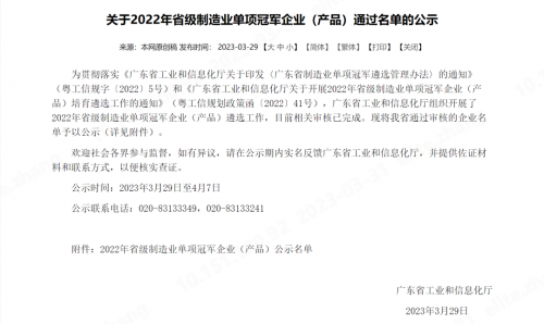 廣東省制造業(yè)單項冠軍是指長期專注于制造業(yè)細分行業(yè)產(chǎn)品研發(fā)和生產(chǎn),具備較好的創(chuàng)新基礎條件和較強的技術(shù)創(chuàng)新能力,生產(chǎn)技術(shù)或工藝達到國際領 先水平,單項產(chǎn)品市場占有率位居全球或國內(nèi)行業(yè)前列的制造業(yè)企業(yè)或工業(yè)產(chǎn)品。培育制造業(yè)單項冠軍,是推動制造業(yè)高質(zhì)量發(fā)展的重要內(nèi)容之一。其旨在引導制造業(yè)企業(yè)專注創(chuàng)新和產(chǎn)品質(zhì)量提升,推動產(chǎn)業(yè)向中高端發(fā)展,提升制造業(yè)國際競爭力,并帶動中國制造走向世界。