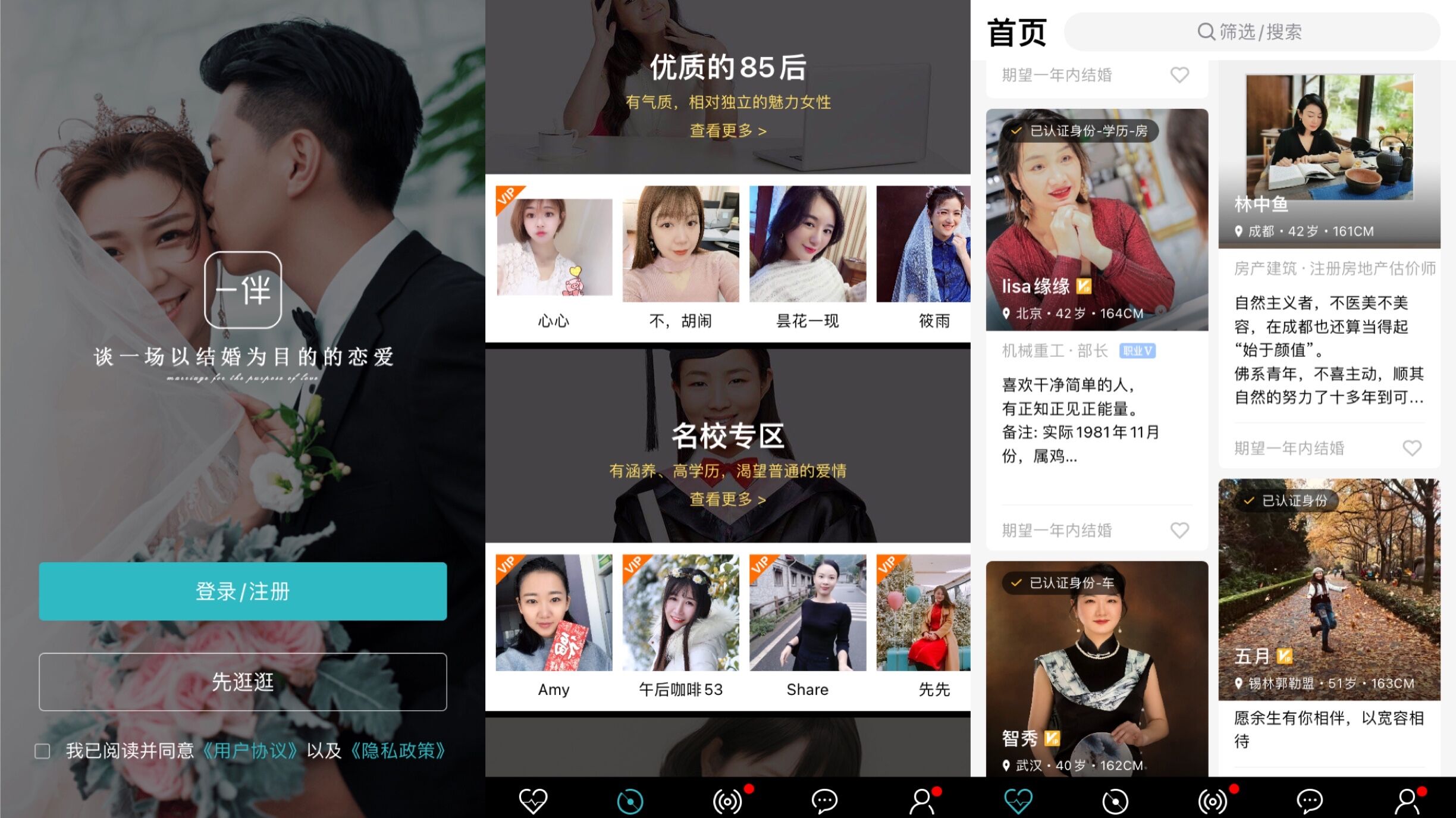一伴婚戀是被德本咨詢/互聯(lián)網(wǎng)周刊評(píng)選為 2021年婚戀社交APP排行榜上NO. 1的軟件。它有三大亮點(diǎn),注冊(cè)嚴(yán)謹(jǐn)、真實(shí)性高、社交高效。首先,一伴必須要實(shí)名制注冊(cè),未滿18周歲和已婚人士不得注冊(cè)。而且認(rèn)證過程比較嚴(yán)格,上傳本人信息都是經(jīng)過幾重認(rèn)證才可通過。避免了非真誠(chéng)找對(duì)象的人乘虛而入,保證了社交環(huán)境的干凈純粹。其次,一伴的交流方式特別高效,可直接添加對(duì)方微信好友,也可以發(fā)小紙條或聊一聊,這些功能都是能讓我們用快的速度更深入地了解彼此。