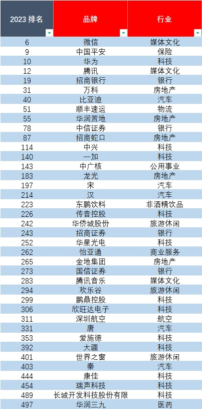 圖中為2023年中國(guó)品牌價(jià)值500強(qiáng)中39個(gè)上榜的深圳品牌