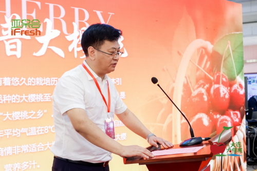 大連金普新區(qū)黨工委委員、金州區(qū)區(qū)委常委、金州區(qū)政 府黨組成員滕毓磐現(xiàn)場介紹金普新區(qū)大櫻桃產(chǎn)品
