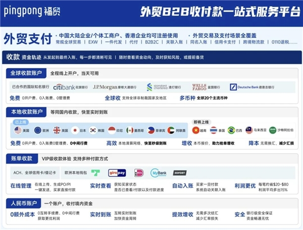 在支持「服務(wù)貿(mào)易」企業(yè)合規(guī)收款的同時(shí),PingPong福貿(mào)還開(kāi)放了付款、結(jié)匯以及多方位的資金管理能力,形成了一個(gè)完整的多場(chǎng)景收款方解決方案。在收款方面,福貿(mào)與包括花旗、摩根大通在內(nèi)的各大國(guó)際知名銀行合作,在17大全球收款賬戶(hù)外,還提供了9個(gè)本地收款賬戶(hù)。其中,本地收款賬戶(hù)支持按本地幣種清算,快至秒級(jí)到賬,無(wú)須任何中間行費(fèi)用,幫助買(mǎi)賣(mài)雙方一同降本增利。