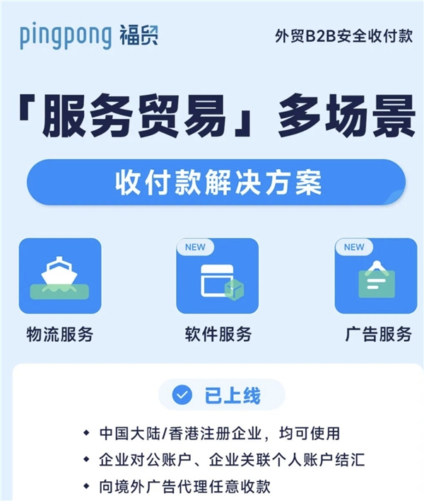 PingPong福貿(mào)「服務(wù)貿(mào)易」還一次性支持了服務(wù)貿(mào)易中的物流服務(wù)、廣告服務(wù)、軟件服務(wù)等3大主要場(chǎng)景。