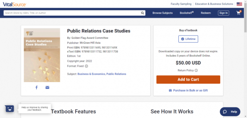 Public Relations Case Studies于2022年在全球發(fā)行并且上線全球最 大電子教材平臺(tái)VitalSource。該平臺(tái)為全球240多個(gè)國家和地區(qū)的數(shù)千家機(jī)構(gòu)和數(shù)百萬學(xué)生提供在線教材和課程資料。
